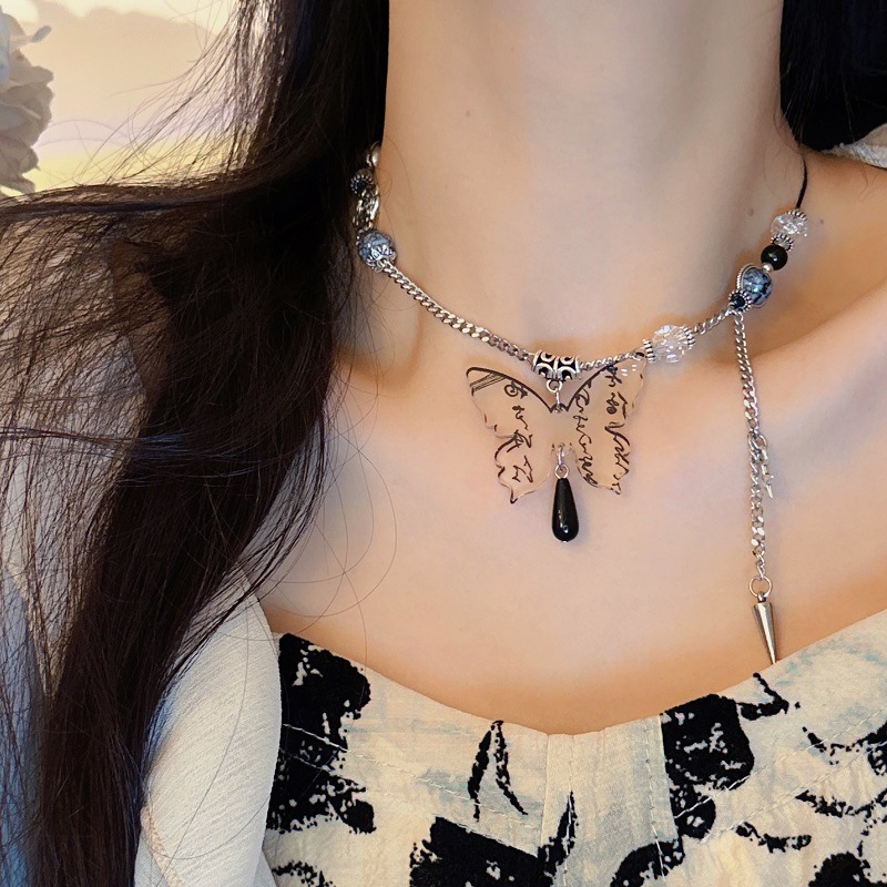 文芸復古水墨風透明蝶ペンダント流蘇ネックレス古風漢字潮流鎖骨鎖女卸売り