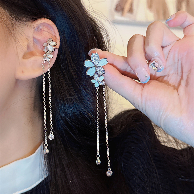 小清新で甘い桜の長いタイプのフリンジ耳クリップ森系非対称ジルコン滴油イヤリングデザイン感耳飾り
