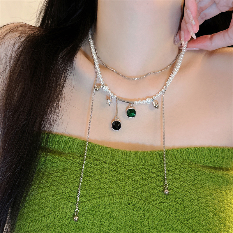 高級感軽豪華ins二重鎖骨鎖気質小衆冷淡風水滴流蘇真珠ネックレスジュエリー