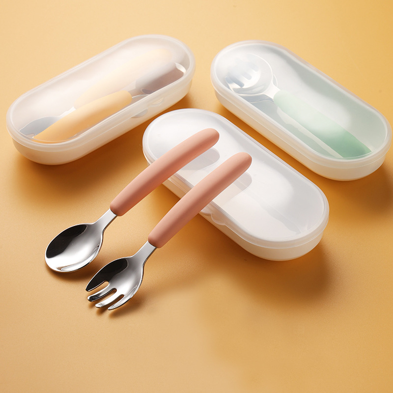 クロスボーダー人気304ステンレスシリコン子供スプーンフォーク2点セットアニメ携帯飼育食器セット