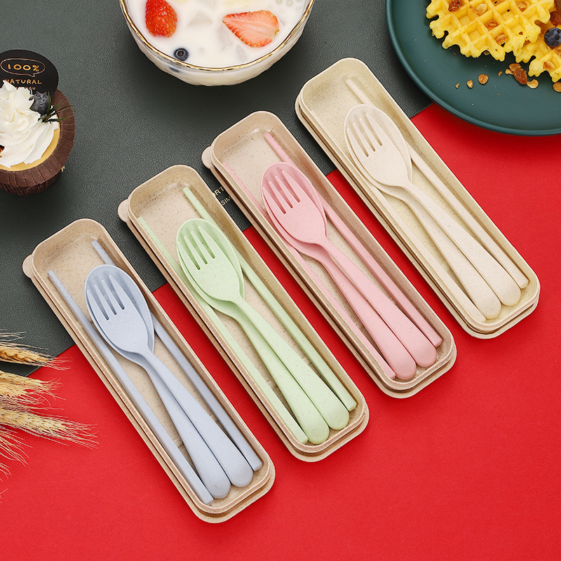 小麦わら携帯食器セットスプーンと箸の子供食器三点セットの販促プレゼントはロゴを印刷できます。