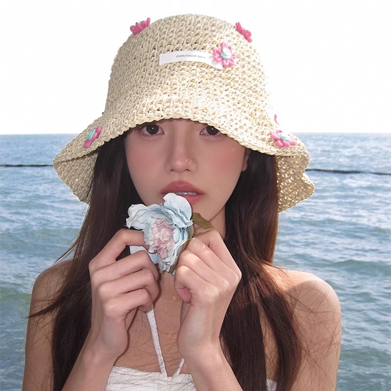 甘い小花草編み漁師帽女2025新型春夏戸外旅行日よけ日焼け止め盆帽は顔が小さい