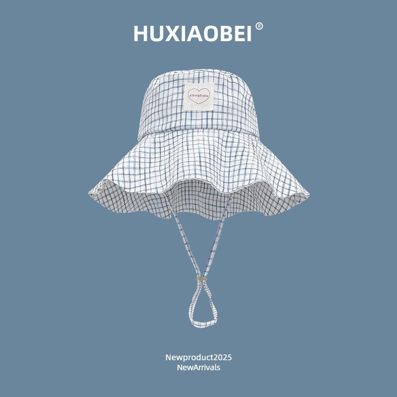 日系insレトロな格子縞布漁師帽女2025年春夏の大きな軒に顔の小さな日焼け止め帽がついている