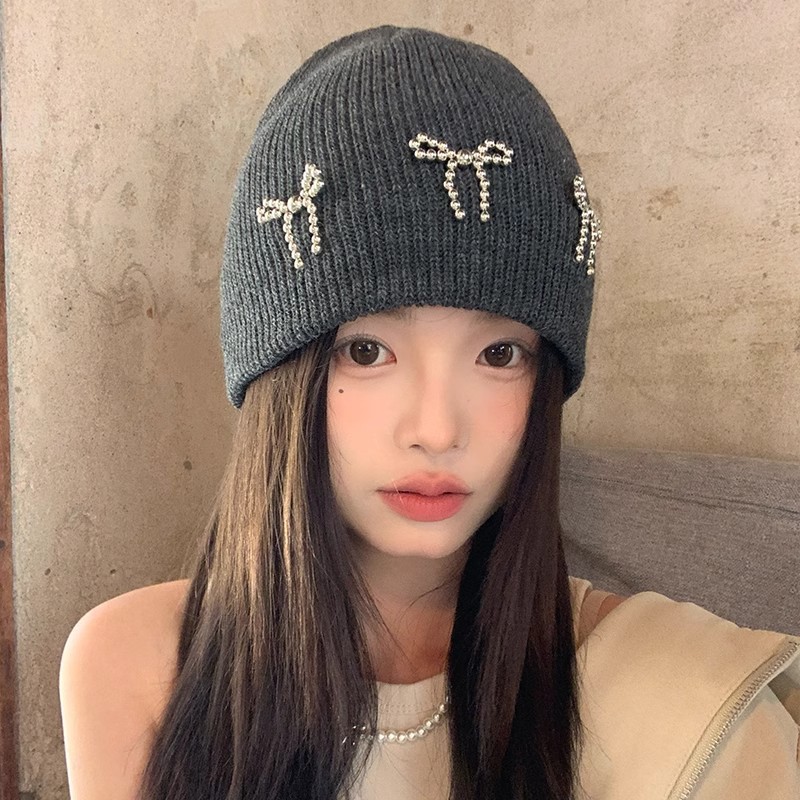 韓国版 ins リボンニットウール帽子女性のための 2024 秋と冬甘い厚く暖かい防風大きな頭のサイズの防寒帽子