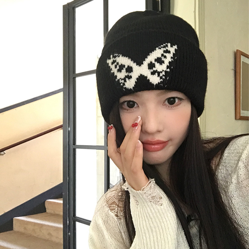 韓国風蝶ニット帽女性の秋冬の新しいスタイルのゆったりとした顔が見える小さな大きな頭囲暖かい耳保護ウール防寒帽子