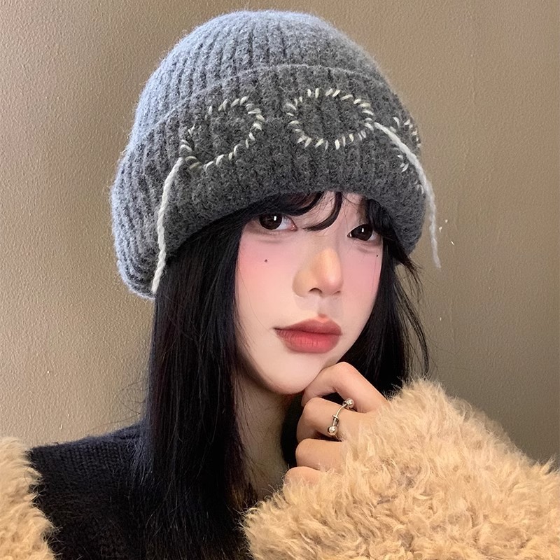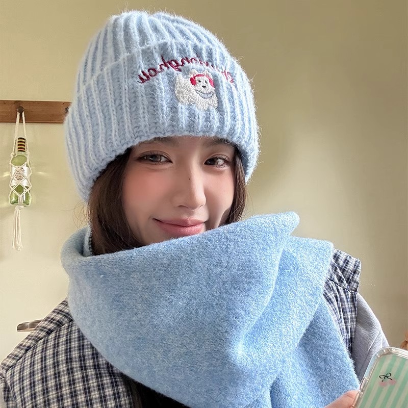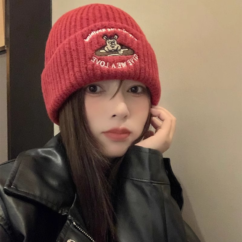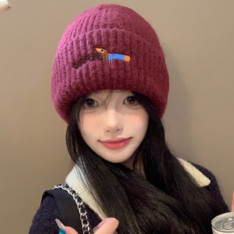 かわいい子犬刺繍ニット帽レディース韓国風秋冬韓国風小顔ウール帽子暖かい包頭帽子トレンディ