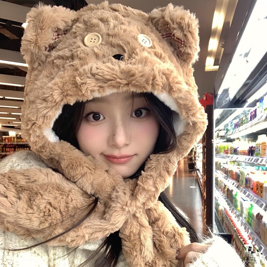 漫画クマぬいぐるみ帽子女性の冬のスカーフオールインワンベルベット厚く暖かい防寒スカーフフード付き雷峰帽子