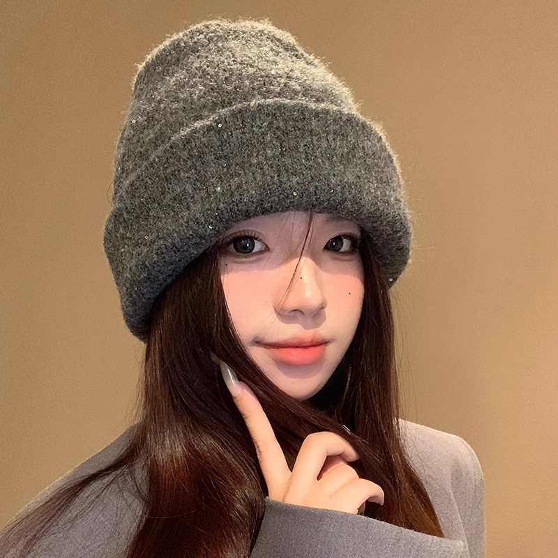 光沢のあるグレーのニット帽、厚みのある女性の冬の韓国スタイルのファッショナブルな小さな包頭防寒帽子、大きな頭囲のウールの帽子