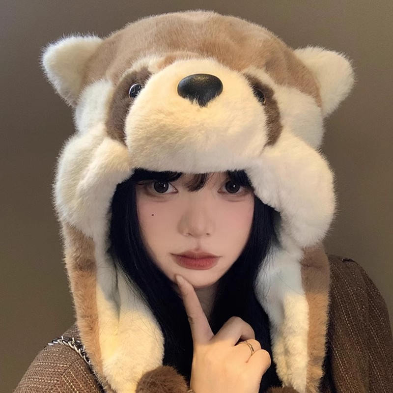 秋冬の女性用のかわいい漫画の小さなアライグマのぬいぐるみ帽子、小さな耳保護帽子、暖かく厚く防寒性のある雷峰帽子