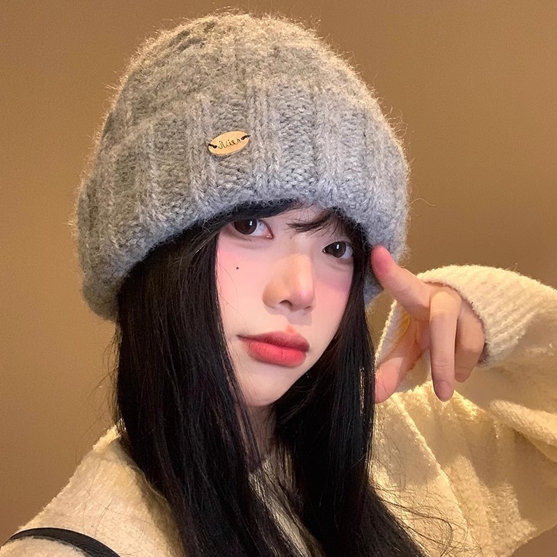 秋と冬の女性用グレーメタルラベルウール帽子、多用途で顔が見える小さな暖かいニット帽子、厚みのある大きな頭囲の包頭帽子