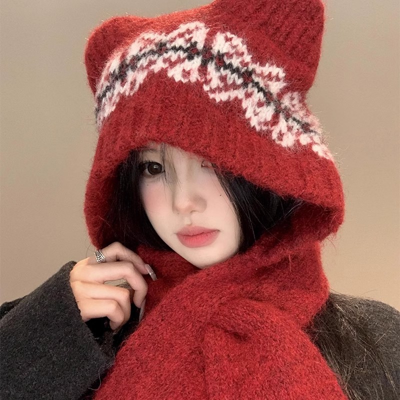 スカーフ一体型クマ耳ニットウール帽子女性用秋冬屋外防寒暖かい包頭雷峰帽子