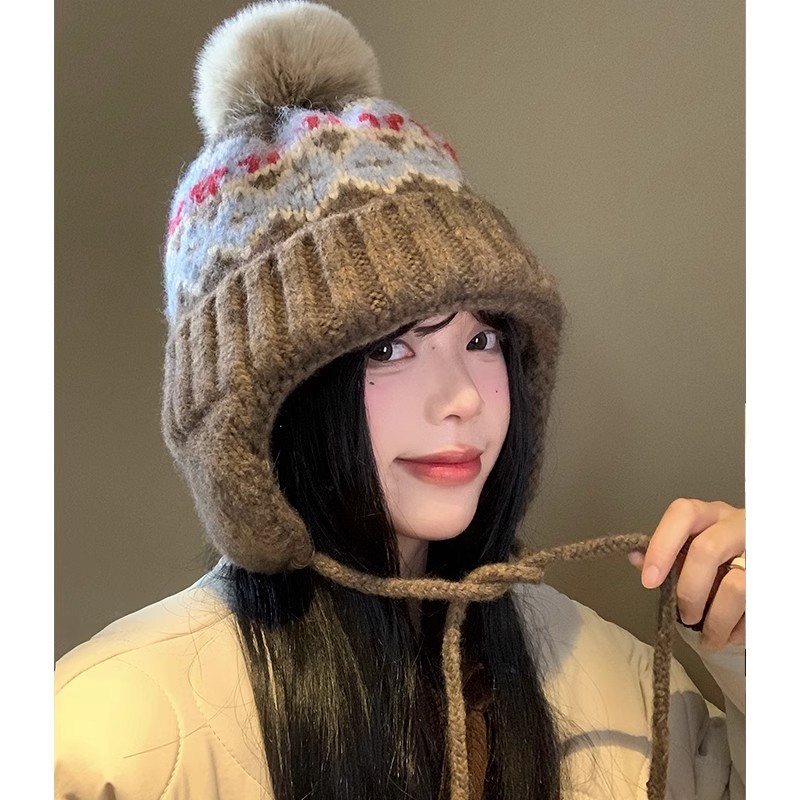 フェアアイルスタイルの女性用ウール帽子、秋冬韓国レトロ多用途暖かいニット帽子、顔が見える小さな耳保護帽子