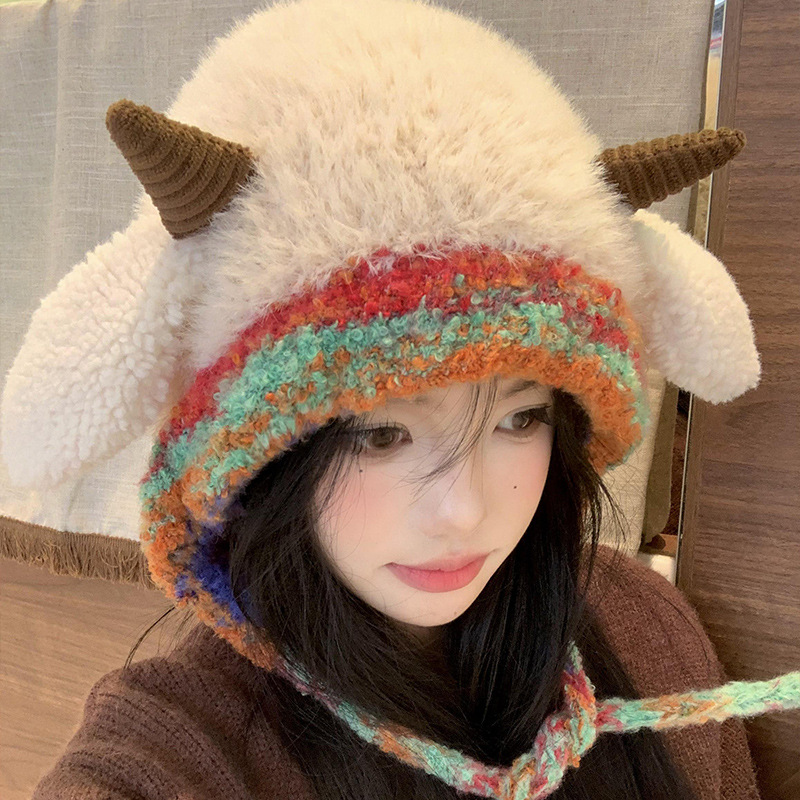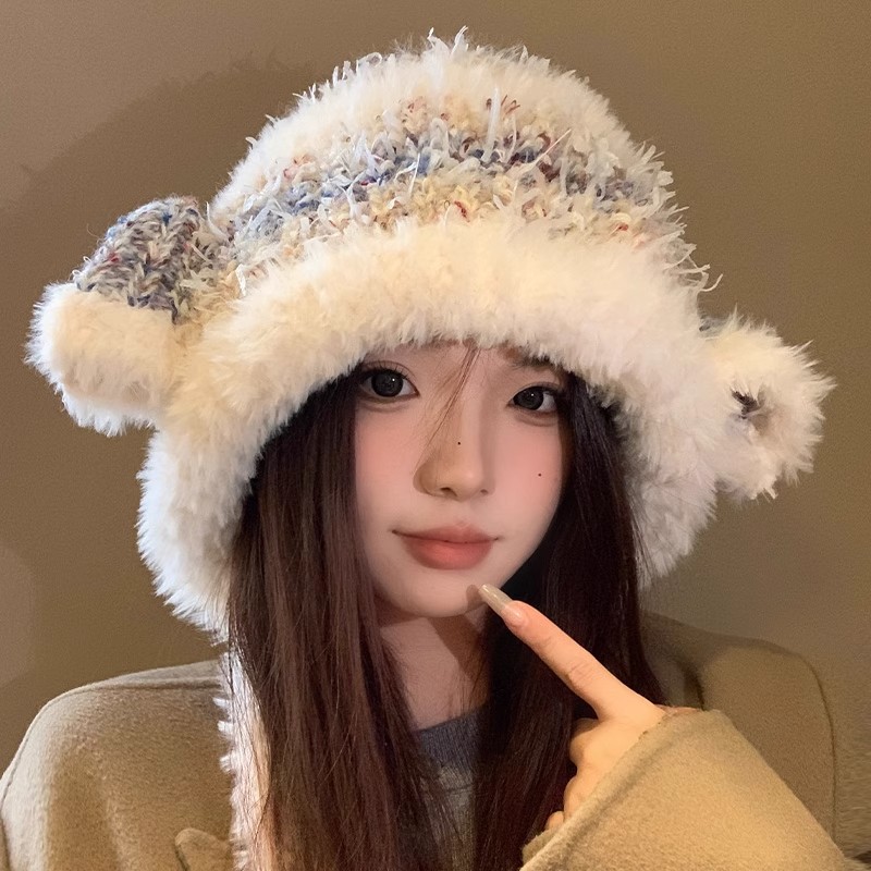 女性用のかわいい小さなウールの帽子、2024年秋冬、顔が見える、厚くて暖かい、ストラップ付き耳保護、トレンディな帽子