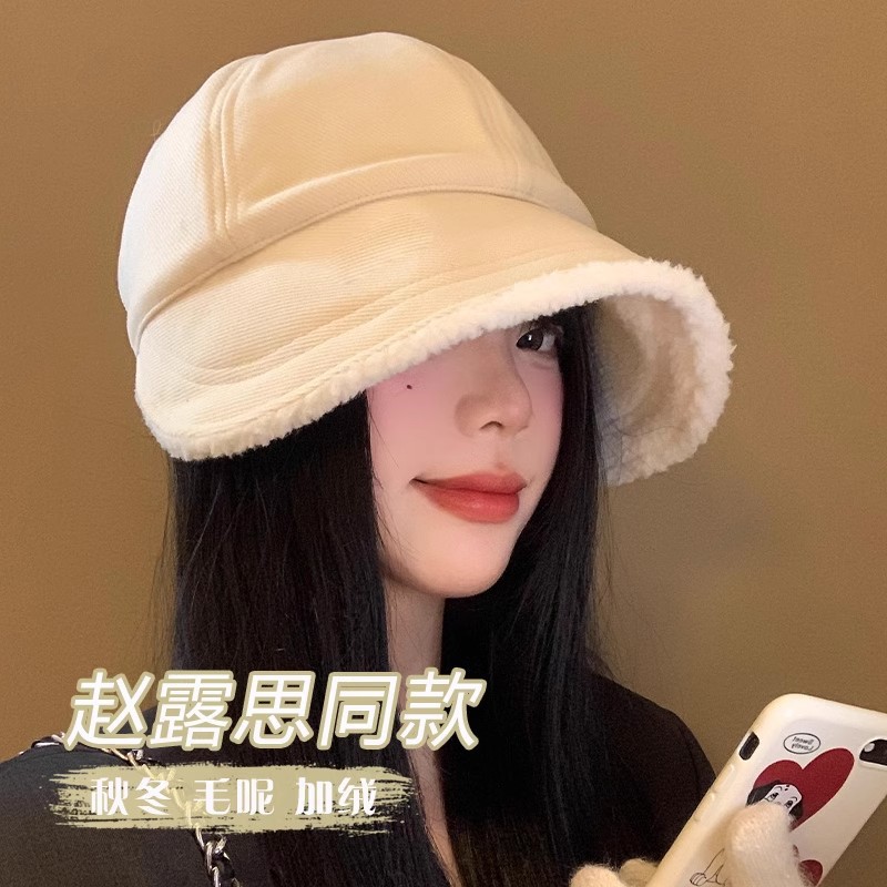Zhao Lusiと同じスタイルの女性用帽子、秋冬のラムウールとベルベットのフィッシャーマンハット、防寒性と暖かさ、顔を大きく見せる小さなひさし付き帽子