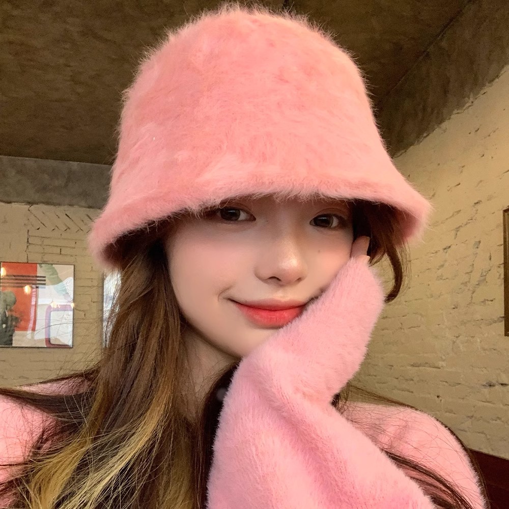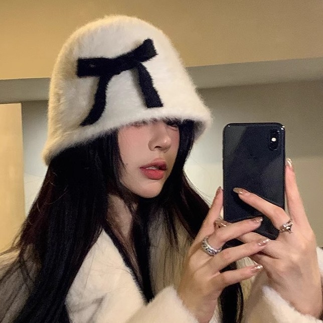 韓国版の甘いリボンウサギの毛の漁師の帽子、女性の秋と冬用、暖かく、シンプルで気質があり、多用途で顔が見える小さな盆地の帽子