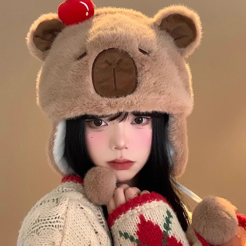 女の子用のかわいいカピバラぬいぐるみ帽子、冬用暖かいつば帽子、漫画の防寒耳保護プルオーバー雷峰帽子