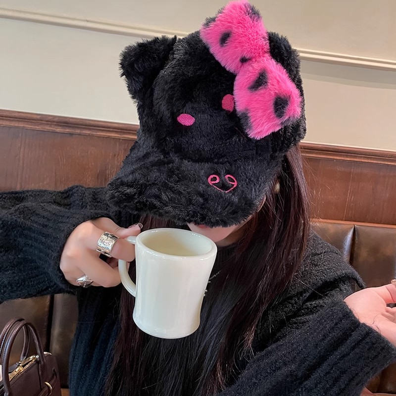 秋冬の女性用ブラックピンク猫ぬいぐるみ野球帽、甘くてクールなヒョウ柄のリボンひさしキャップ、顔が見える小さな暖かい帽子