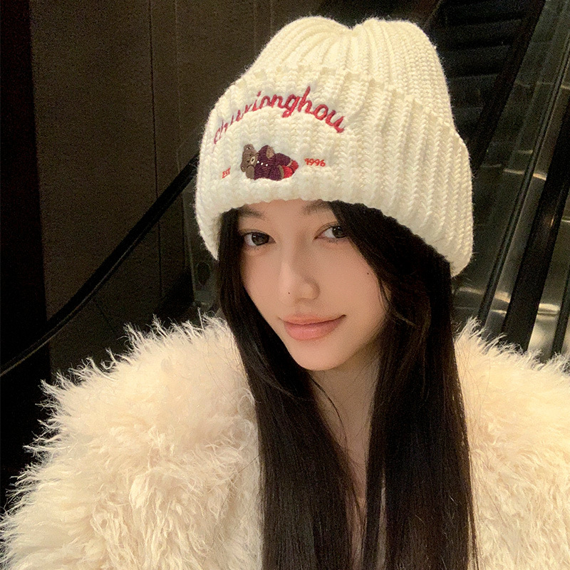 かわいいクマの暖かいウールの帽子、女性用、韓国風の秋と冬のカジュアルで多用途な耳保護ニットつば帽子、顔が小さく見える