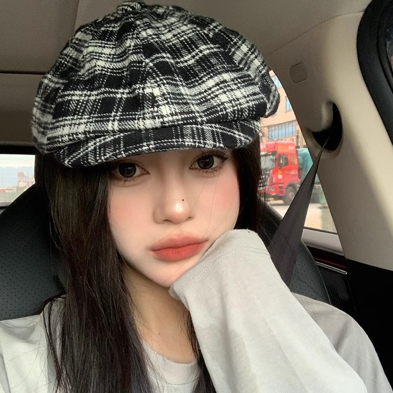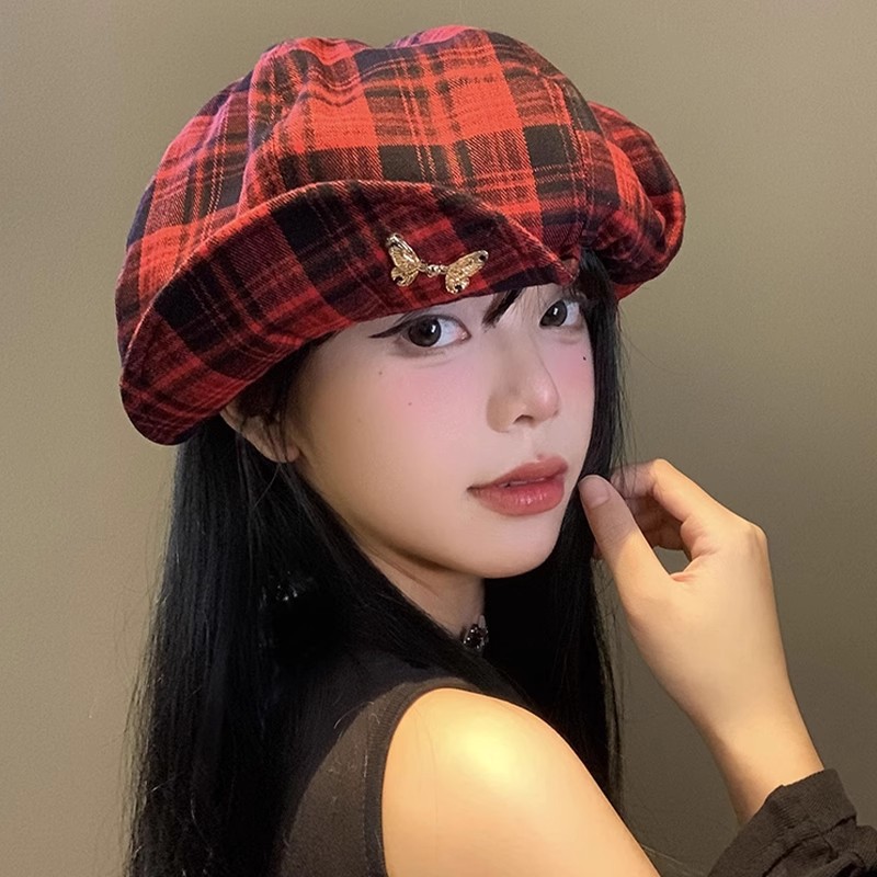 韓系ins格紋蝶雲八角帽子子供2024新秋冬百合顔小画家帽子