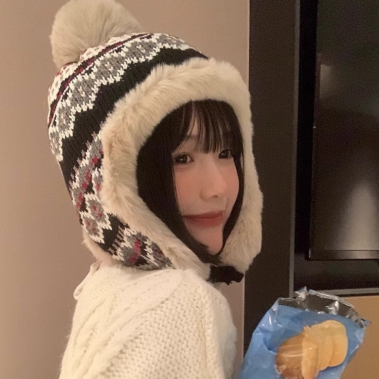 韓国風ニット耳保護帽子、女性用、秋冬顔見せ、小さなぬいぐるみ、厚く暖かい、防風サンダーハット、サイクリング防寒帽子
