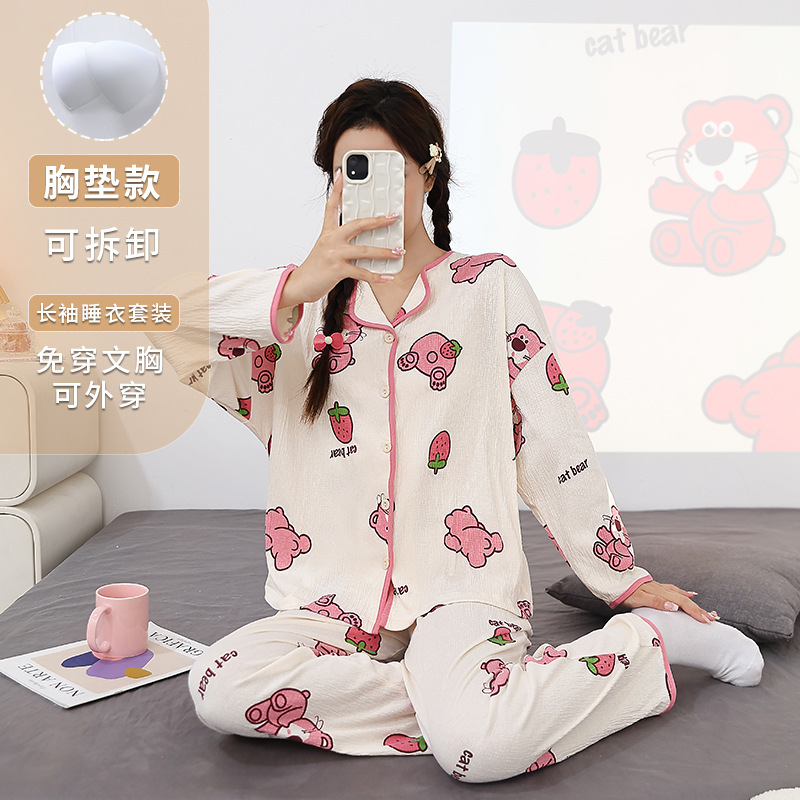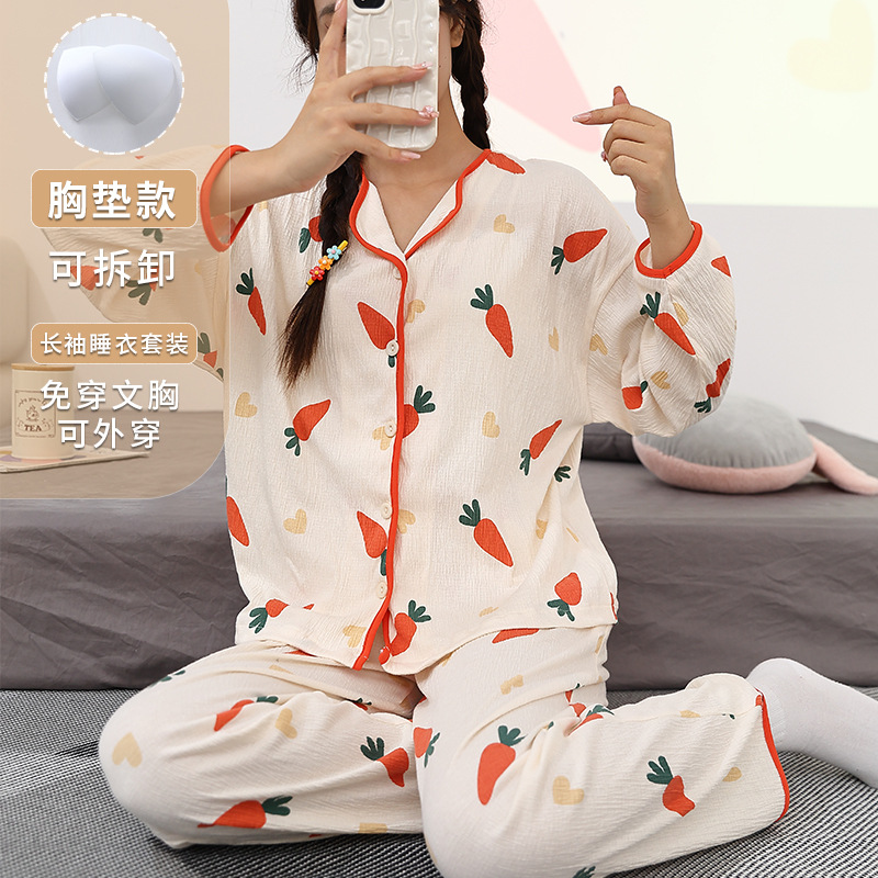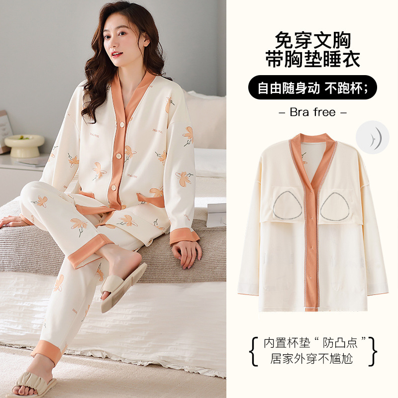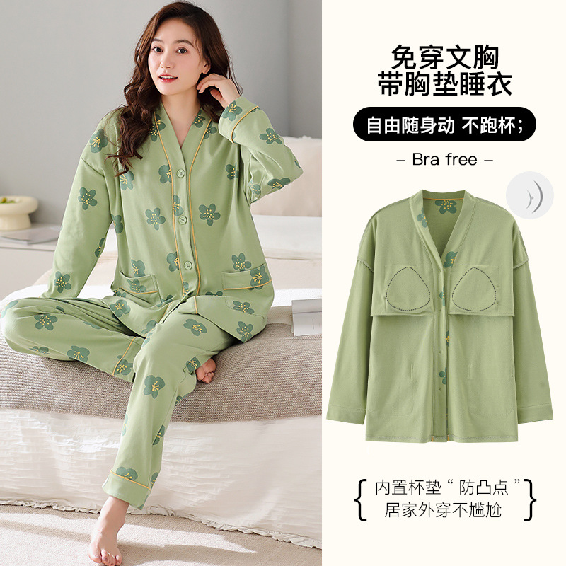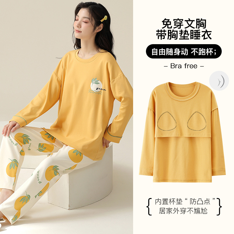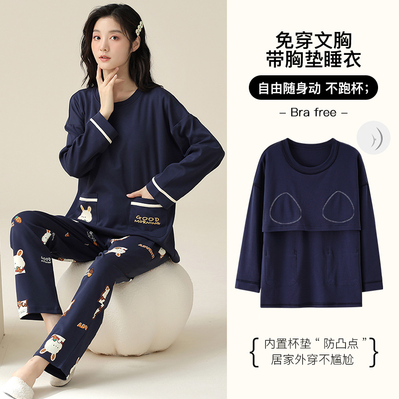 胸パッド付き春秋パジャマ女性綿質長袖プルオーバー