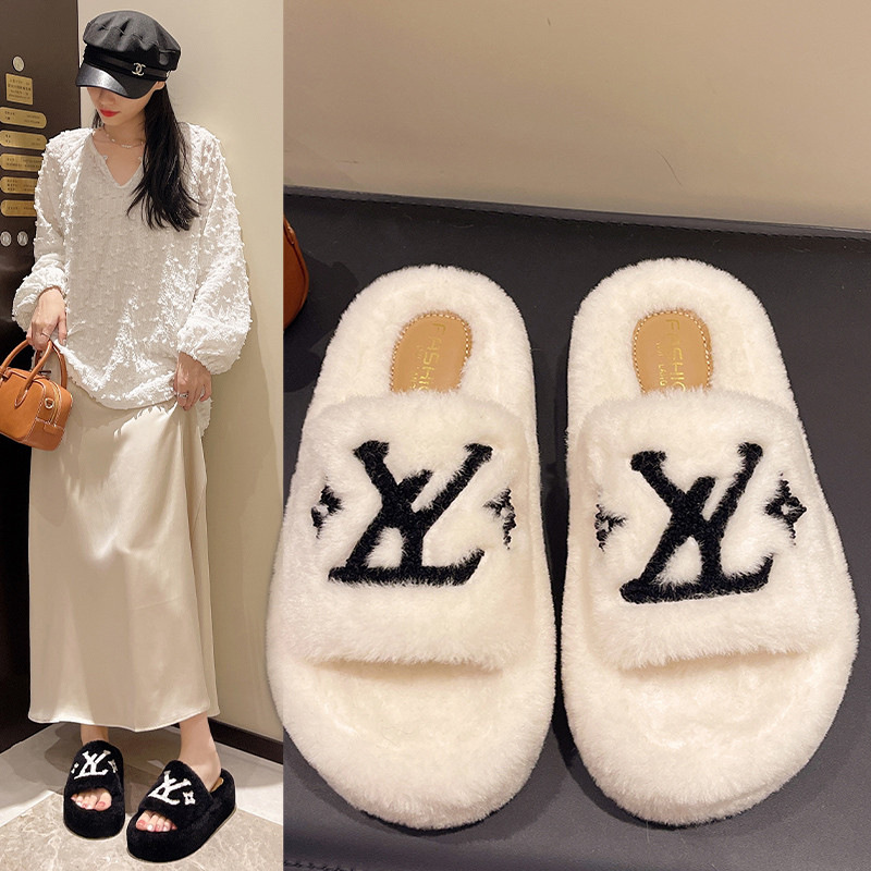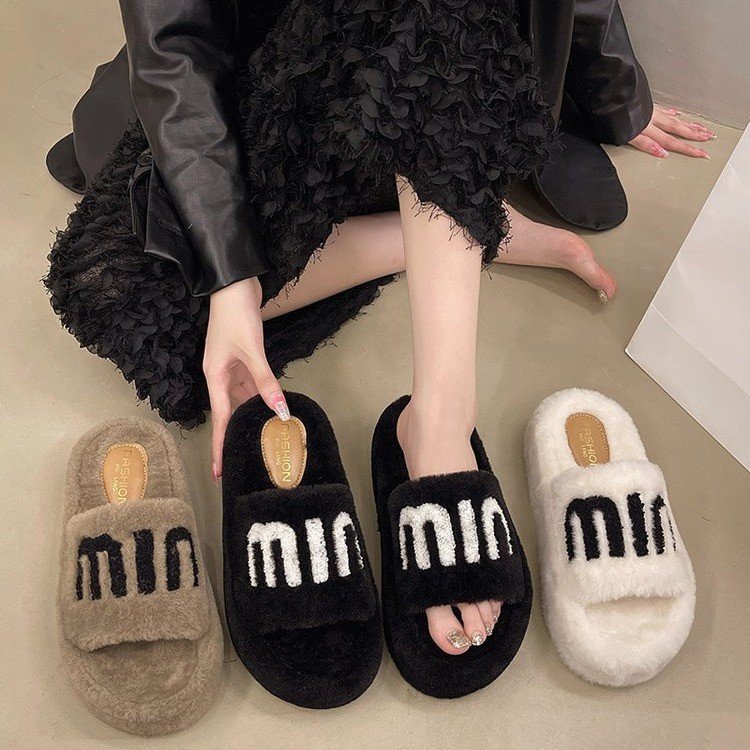 外国貿易の毛のスリッパの女性の2024秋の新型の足の指の刺繍のアルファベットの外は平底の大きいサイズの綿毛のスリッパを着ます。