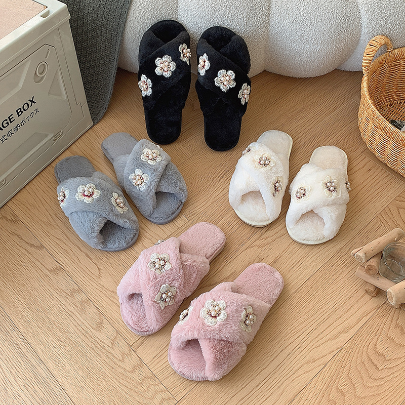 2024秋冬の花の真珠のぬいぐるみのかわいいファッション家の家は交差してフラットな毛のスリッパの女性を引きずって外に着ます。