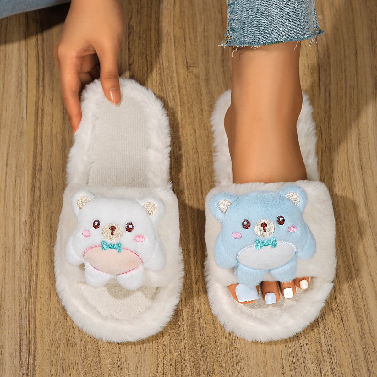 秋冬の新型の1字の毛のスリッパの女性のファッションの平底の露指の室内の対外貿易の43大サイズの越境のぬいぐるみのスリッパ