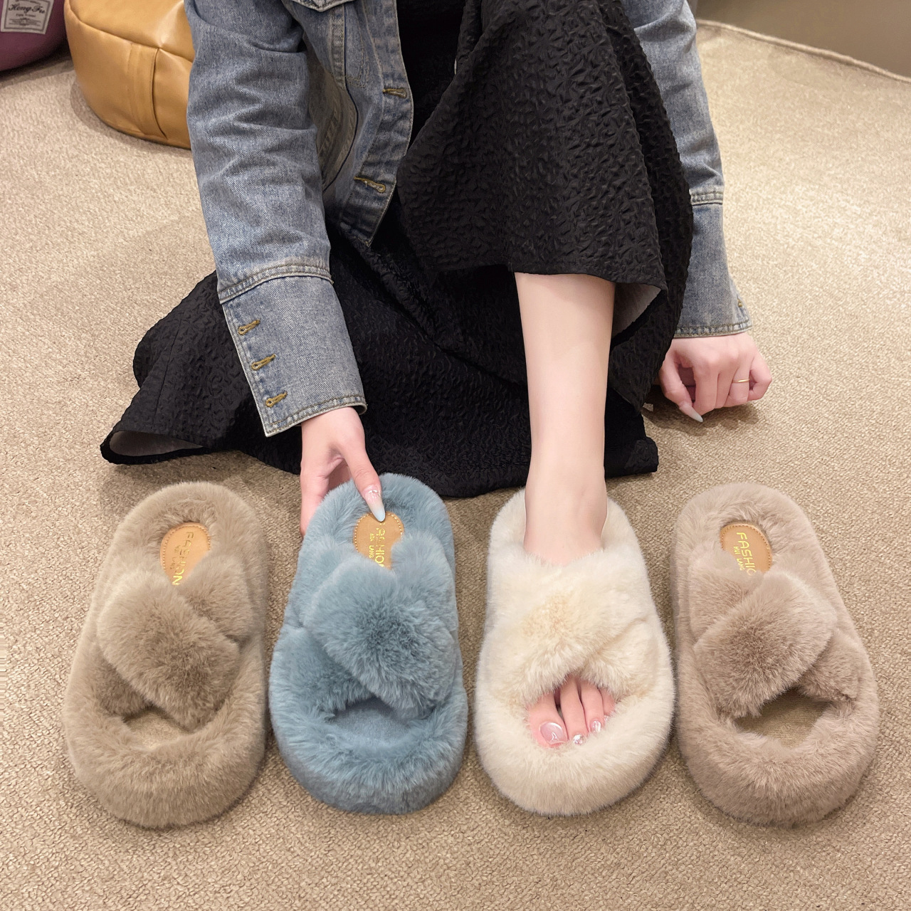 国境を越えた秋冬の毛羽立ちスリッパの女性2024新一字家庭保温毛引き幅版綿スリッパ42大サイズ
