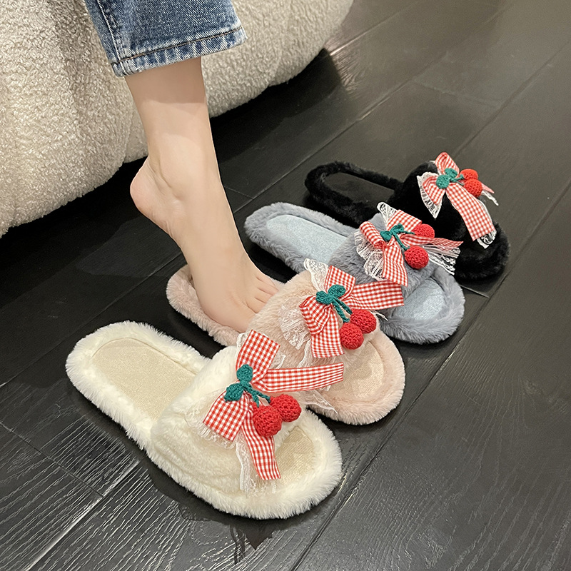 秋冬の新型の毛のスリッパの女性のかわいい少女の蝶結びのさくらんぼの室内の1字のぬいぐるみのスリッパの卸売り