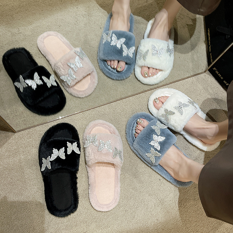 2024秋の新しい家庭の毛のスリッパの女性の明るいドリルの蝶結びのぬいぐるみの字は室内の綿のスリッパの卸売りを引き延ばします。