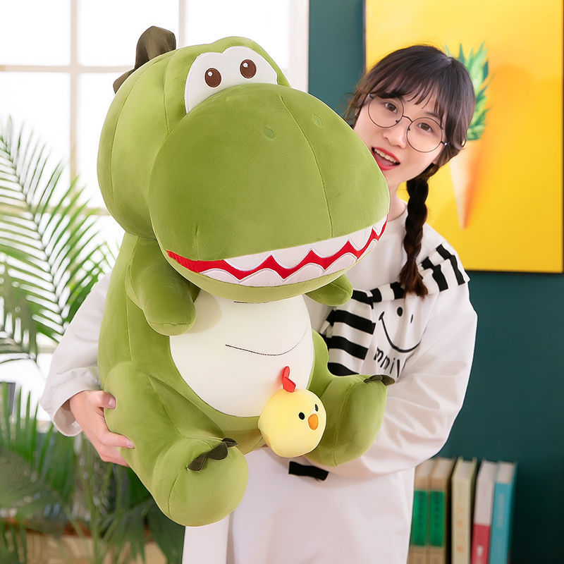 かわいいぼうっとしているニワトリの小さい恐竜のぬいぐるみの大きいサイズの恐竜のぬいぐるみのベッドは寝ます。