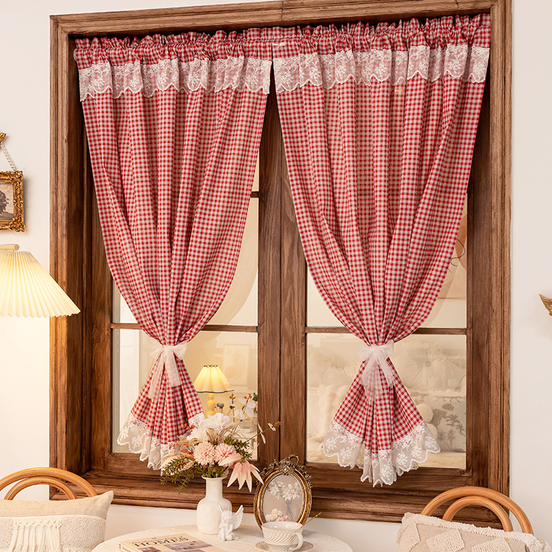 アメリカの地中海レースの田園風の小さいカーテンの戸棚の防塵カーテンの小さい清新な赤い格子のハーフカーテンのカーテン