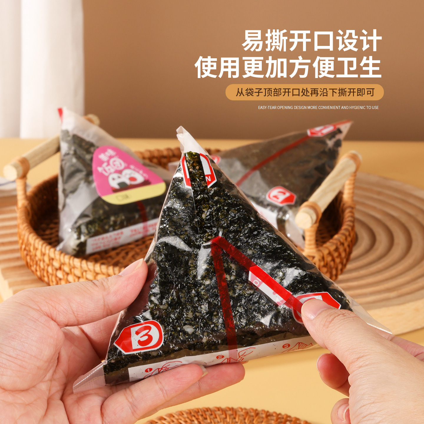 日本式二重三角おにぎり包装袋低温防霧帯易裂条食品級使い捨て寿司包装袋