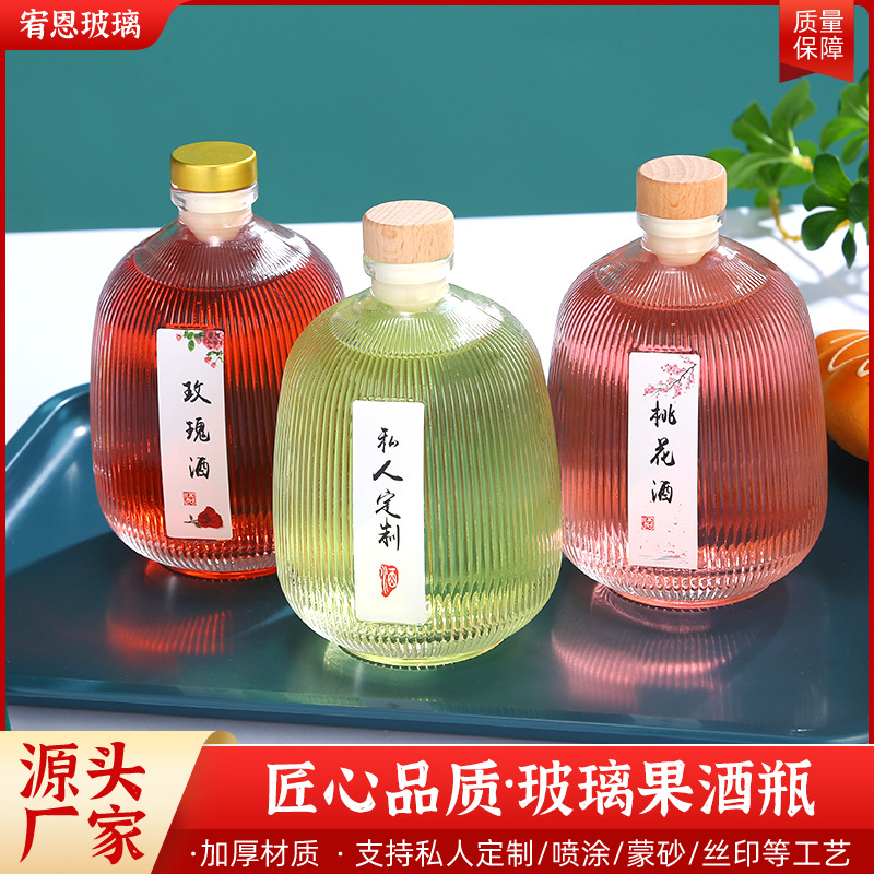 縦ストライプのワインボトルの空の瓶の高さの顔の値の500mlは自分で梅酒の瓶の高級な密封の洋酒の瓶を作ってラベルを持ちます。