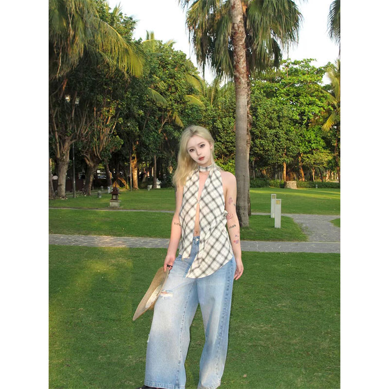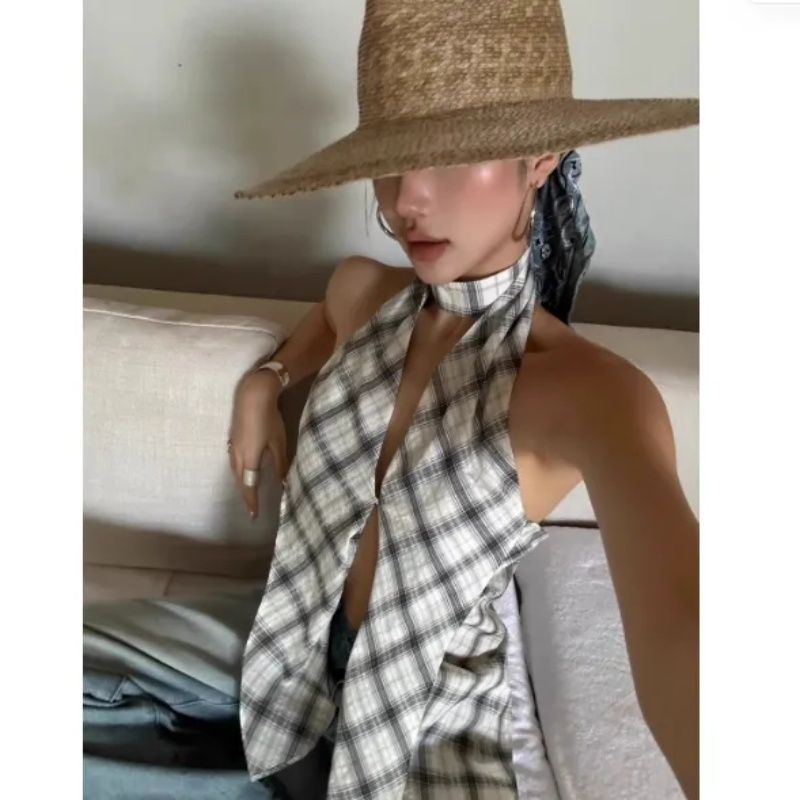 フレンチレトロ V ネックチェック柄ホルターベスト 2025 夏の新デザインバックレスノースリーブキャミソールトップ女性のための