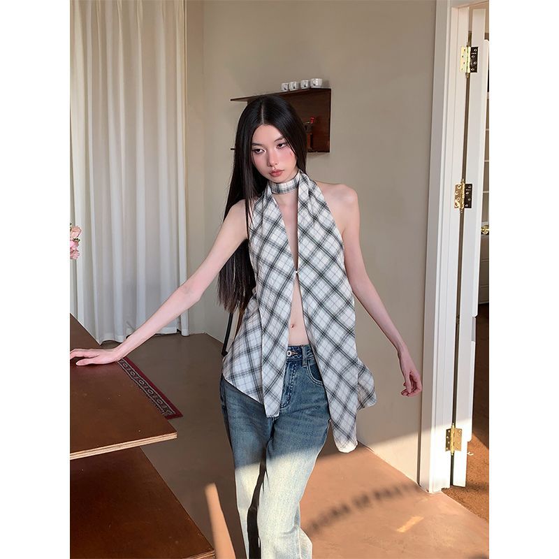 セクシーなトレンディなチェック柄ホルターネックベストデザインバックレスノースリーブキャミソールトップ女性のための 2025 夏の新スタイル