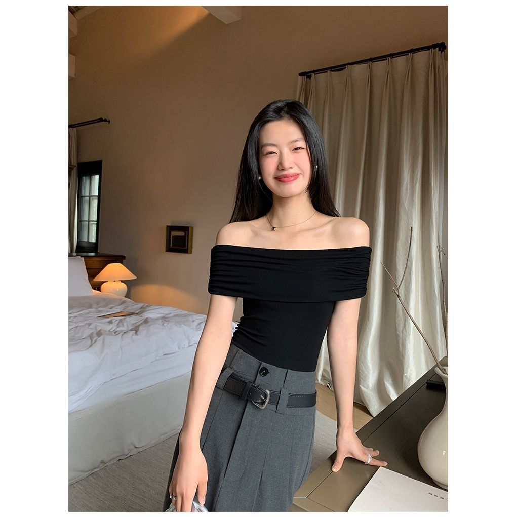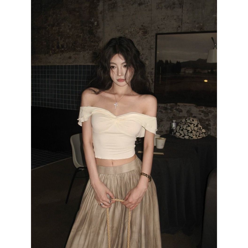 【来年版もご用意しております】女性用ワンショルダーTシャツ、夏ニッチ気質、スリムでホットな女の子のオフショルダー鎖骨トップス