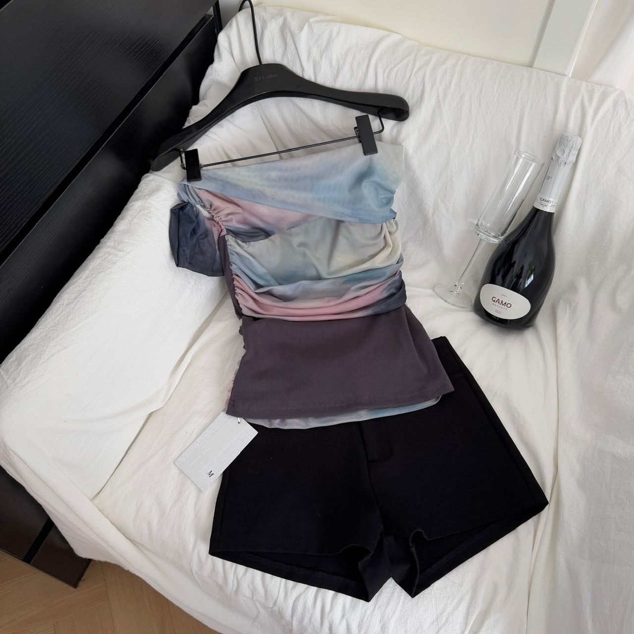 Pure Desire Hot Girl ワンショルダーステッチスミッジメッシュトップ女性用夏デザイントレンディなプリーツショート Tシャツ女性用