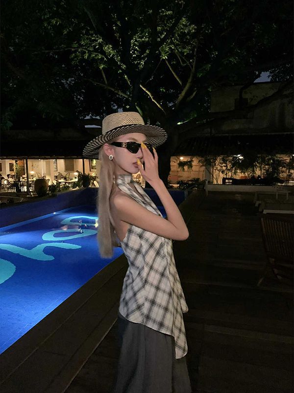 セクシーなホットガールトレンディなチェック柄ホルターネックベスト夏の純粋な欲望デザイン気質バックレスノースリーブキャミソールトップ女性用