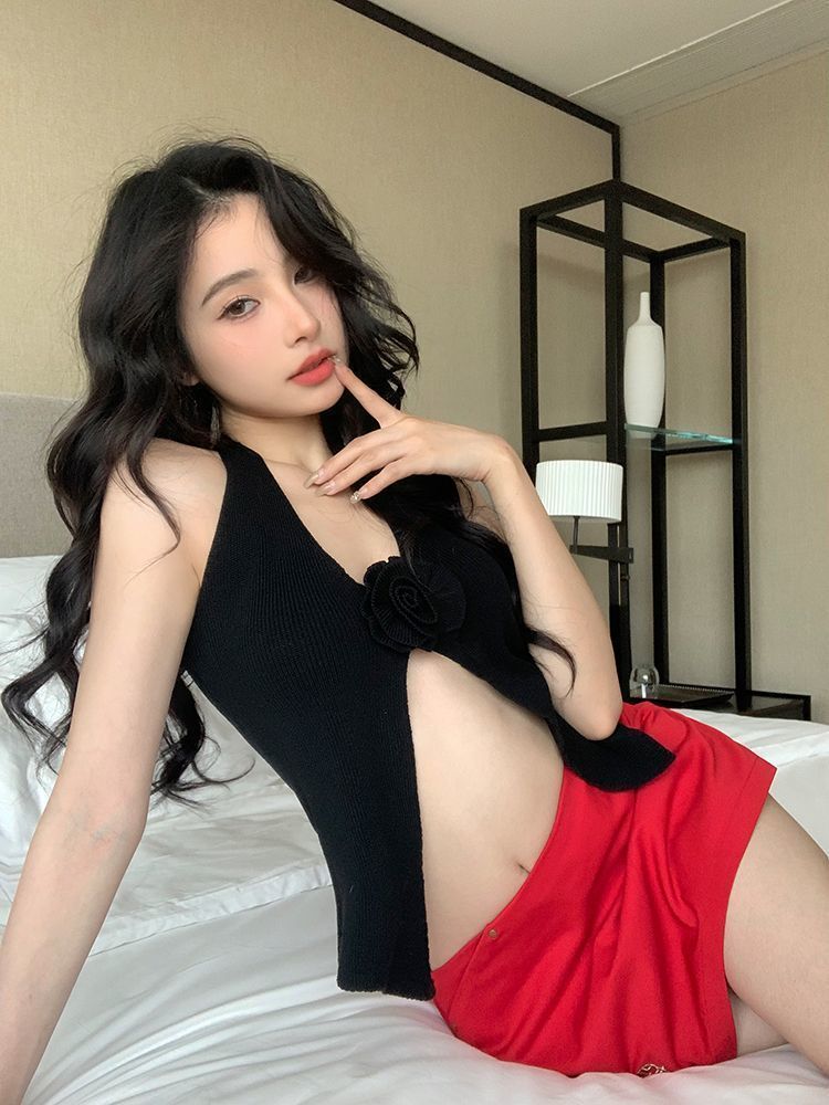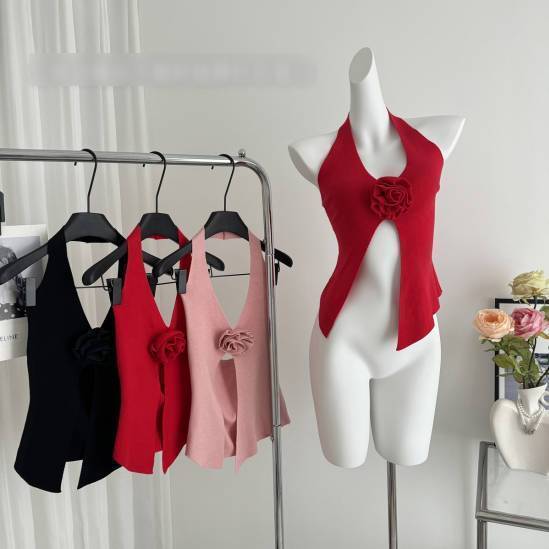 タイの赤い立体ローズホルターネックセクシーベスト2025新しい純粋な欲望スタイルの不規則なスリットトップ女性用