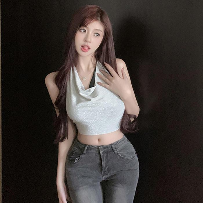 【越境卸売】セクシーな純粋な欲望の明るいシルク反射バックレスロープホルターネックキャミソールタイト痩身トップ