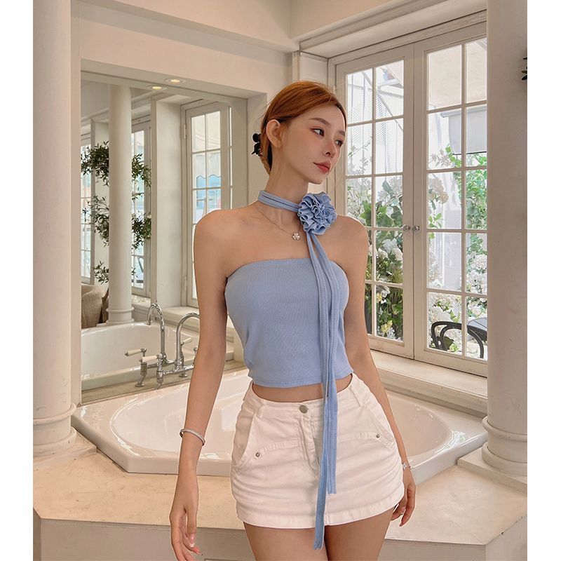 タイのホットガールスタイルの立体的な花のホルターネックチューブトップ女性の純粋な欲望の気質痩身ショートノースリーブトップ