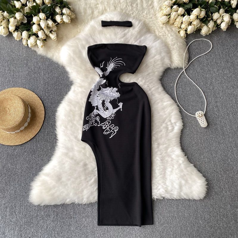 【20点で送料無料】レトロチャイナドレス、チューブトップイブニングドレス、国民的トレンドプリント、中国風スリット中空ドレス