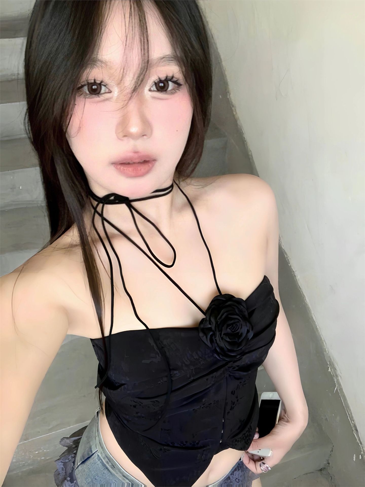 【月間10万個販売】レトロセクシーブラックローズホルターネックベストレディースホットガールスタイルアウターウェア万能スリムショートトップ