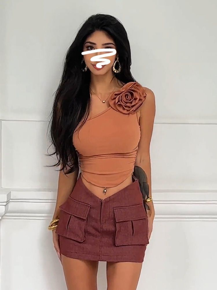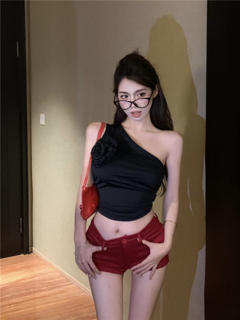 [国境を越えた卸売] セクシーなホットガールフレンチ立体フラワー斜め肩タイト痩身ショートTシャツトップ女性夏用