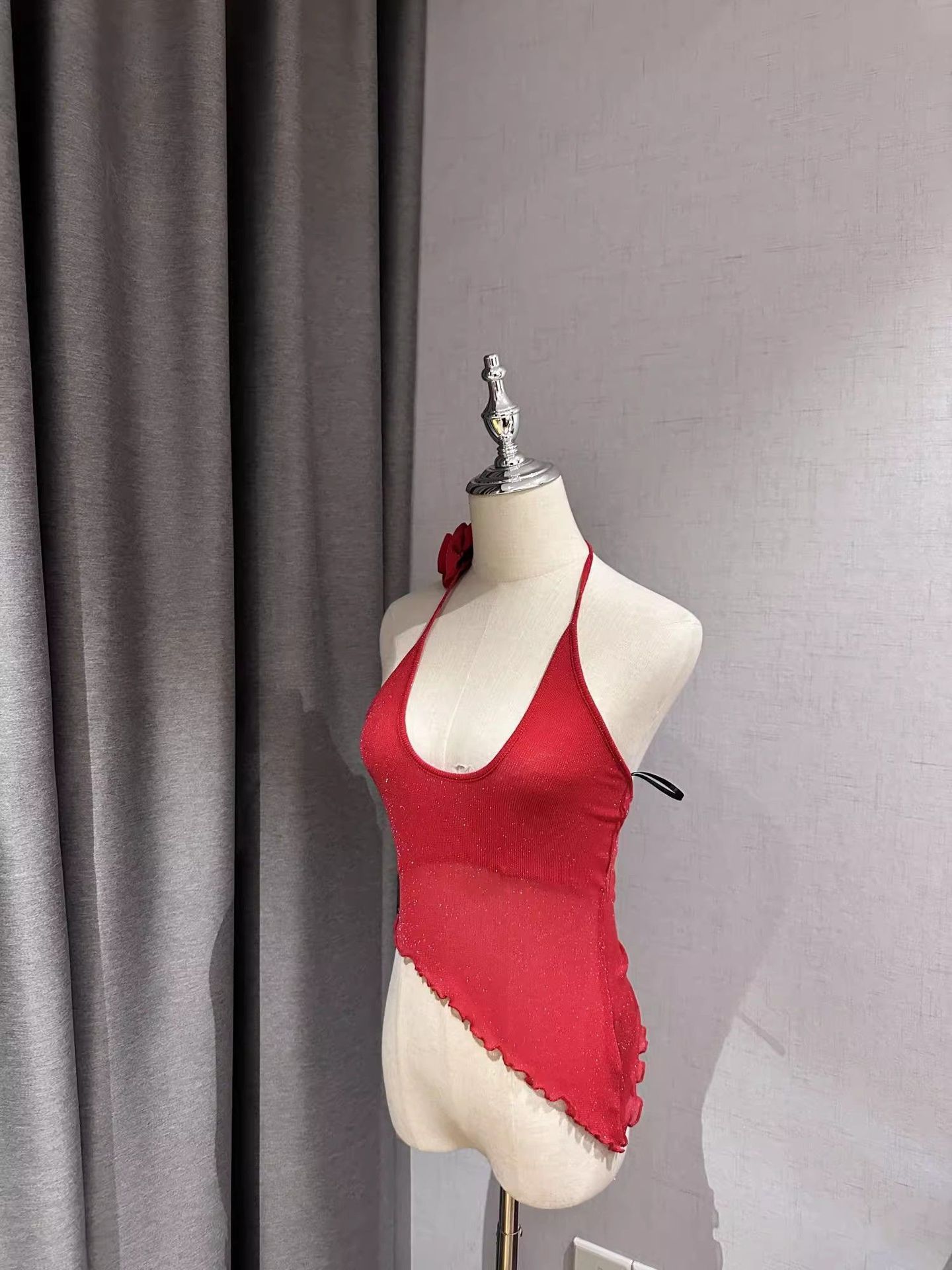 タイ東南アジアレッドローズホルターネックベスト夏の新しい社交家スタイルサスペンダーフリル甘くてクールなトップ