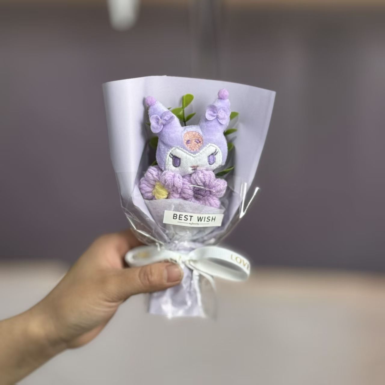 漫画の人形はバケツの花束を抱いて彼女にバレンタインデーのプレゼントをプレゼントします。