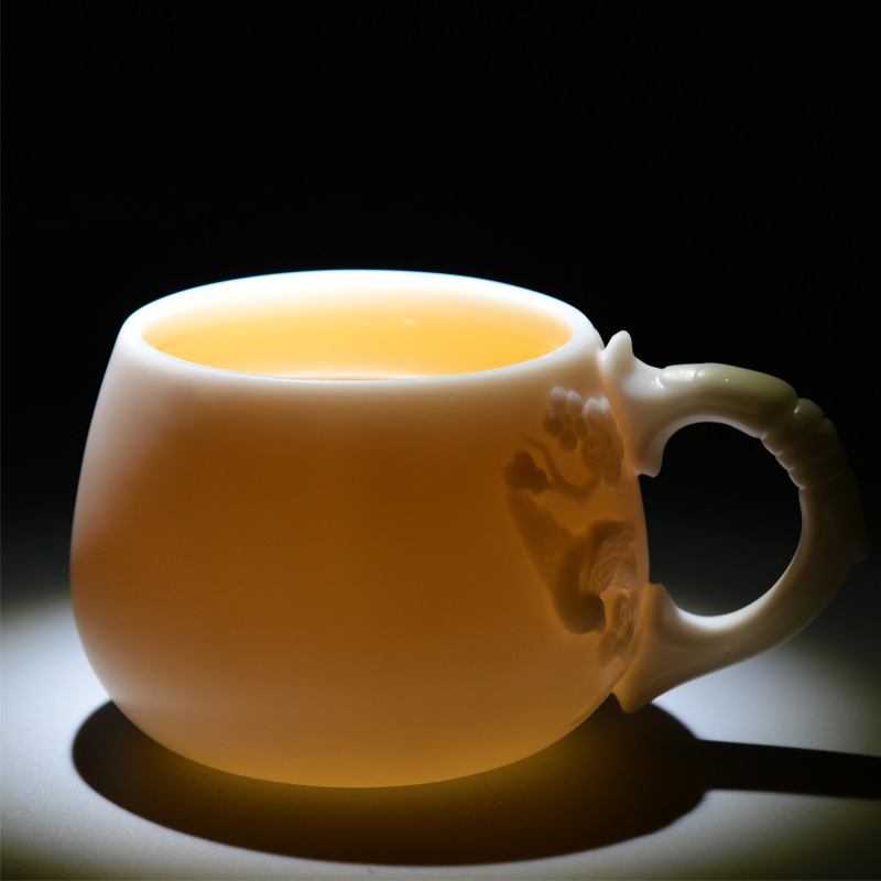徳化高級羊脂玉磁器の事務カップの素焼き帯は白磁のコップのコーヒーカップの贈り物のロゴを彫刻して作ります。