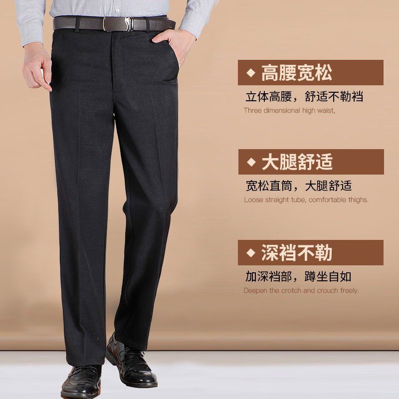 中高年向けアイスサマー薄手メンズパンツ、ノンアイロン、シワになりにくい、縦型ビジネスカジュアル、ハイウエスト、ゆったりロングスタイル